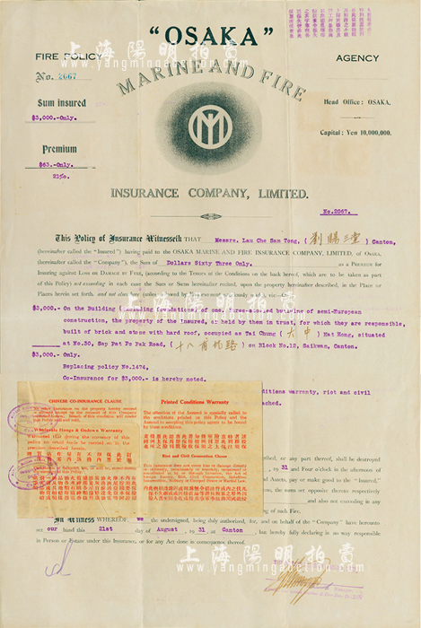 1931年大阪海洋和火灾保险公司保单1份,在广东投保,背贴广东财政厅保险税票4枚;八成新
