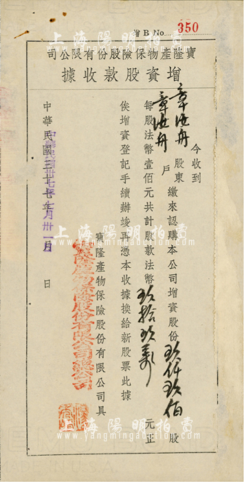 民国卅七年(1948年)宝隆产物保险股份有限公司增资股款收据,玖仟玖佰股计法币玖拾玖万元,票上股东与上件拍品同为章汝舟氏;少见,有水印,八成新