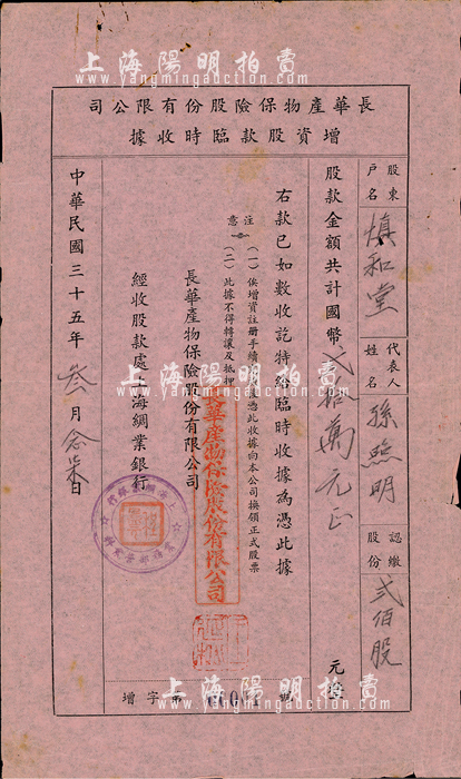 民国三十五年(1946年)长华产物保险股份有限公司增资股款临时收据,贰佰股计国币贰拾万元,由上海绸业银行经收股款,票上股东孙照明氏乃上海棉布业巨商、协大祥绸布庄老板;此股票号码为“增字第00001号”,尤为值得珍视,八成新