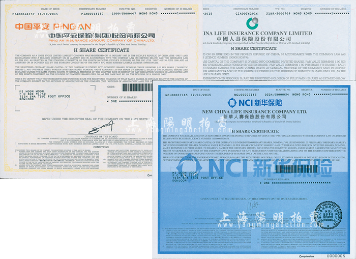 2015年中国人寿保险股份有限公司股票、中国平安保险(集团)股份有限公司股票、新华人寿保险股份有限公司股票共3种不同,面额均为1股;此乃大陆在香港上市之保险公司股票,均有水印,九八成新