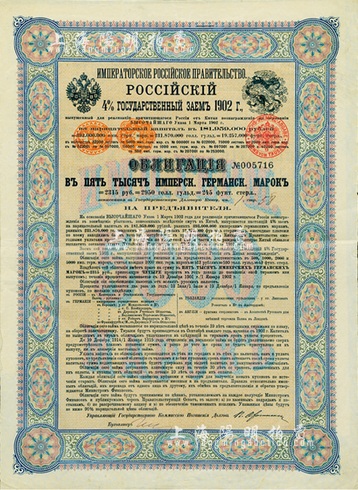 1902年俄国发行对清朝政府(庚子赔款)借款债券5000马克,背英文条款中有“China”(中国)及相关说明;此为最高面额,德国高文编《中国对外债券》第130页有载,目录无定价,少见,八成新