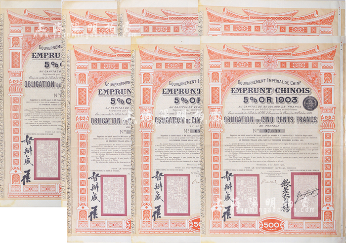 1905年大清帝国政府对外发行汴洛(开封至洛阳)铁路公债500法郎共7枚,上有钦差大臣杨(兆鋆)、督办盛(宣怀)签名及官印;海外藏家出品,八成新