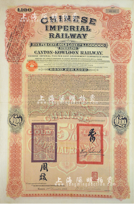 1907年大清帝国政府对外发行广九(广州至九龙)铁路债券100英镑,有两广总督周馥等签名及官印,由中英银公司(British and Chinese Corporation, Ltd.)代理发行,八成新