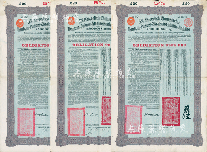 1908年(光绪三十四年)大清帝国对外发行津浦铁路债券绿底紫色20英镑共3枚(不同手签名),由德华银行(Deutsch-Asiatische Bank)代理发行,票上有中文;八成新