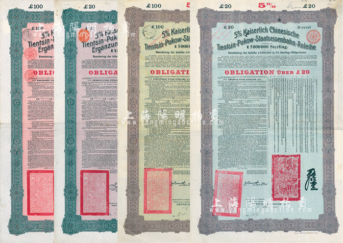 1908年(光绪三十四年)大清帝国对外发行津浦铁路债券20英镑、100英镑,1910年(宣统二年)大清帝国政府对外发行续借津浦铁路债券20英镑、100英镑,合计共4枚大全套,均由德华银行(Deutsch-Asiatische Bank)代理发行,上印中文;海外藏家出品,八成新
