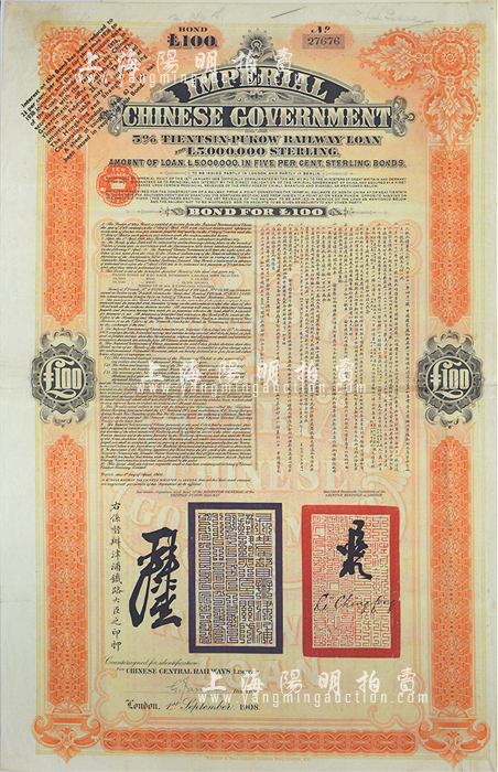 1908年(光绪三十四年)大清帝国政府对外发行津浦铁路债券桔色100英镑,由英商伦敦华中铁路公司(Chinese Central Railways Ltd., London)代理发行,有督办津浦铁路大臣吕海寰、驻英大臣李经方(李鸿章之子)签名及官印,八成新