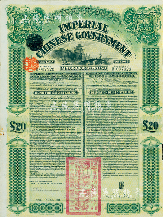 1909年大清帝国政府对外发行京汉铁路债券20英镑,上印英国著名版画家托马斯·阿洛姆手绘的西直门图景,由东方汇理银行(Banque de L'Indo-Chine)代理发行,驻法公使刘式训签名,八成新