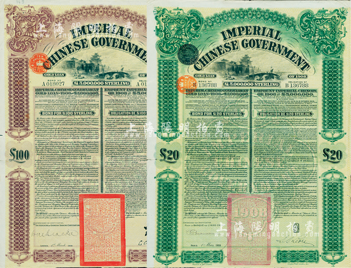 1909年大清帝国政府对外发行京汉铁路债券20英镑、100英镑共2枚不同,分别由东方汇理银行(Banque de L'Indo-Chine)和英商香港上海汇丰银行(Hong Kong & Shanghai Banking Corporation)代理发行,上印北京西直门图景,八成新