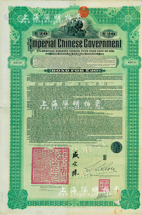 1911年大清帝国政府对外发行湖广铁路债券20英镑,由东方汇理银行(Banque de L'Indo-Chine in Paris)代理发行,邮传部尚书盛宣怀、驻法公使林桐实签署,八成新