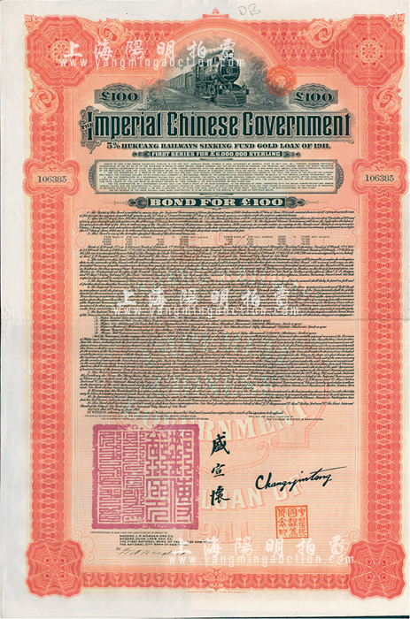 1911年大清帝国政府对外发行湖广铁路债券100镑,由美国摩根大通银行(Messrs. J. P. Morgan and Co.)等代理发行,上印邮传部尚书盛宣怀签名,附带有息票;此摩根大通发行的外债存世极为少见,八成新