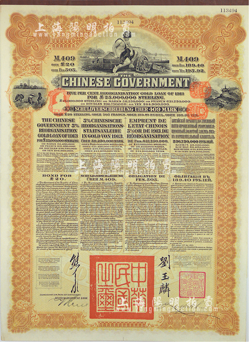 1913年中华民国政府向五国银行团善后大借款公债409马克,由德华银行代理发行,棕色印刷,由北洋政府总理兼财政总长熊希龄、驻英公使刘玉麟签署;八五成新
