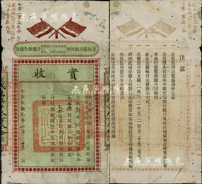 民国九年(1920年)福建财政厅·内国公债闽局“实收”1张,由邓步钲氏交到大洋贰拾贰元伍角购买民国八年公债票贰拾伍元(9折),上印五色双旗,背印注意事项;少见,七成新