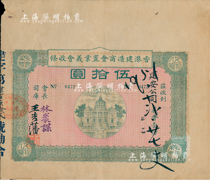 民国癸年(1923年)香港建造商会置业义会收条,义会壹份伍拾圆,背印章程;此券实为债券之性质,少见,八成新