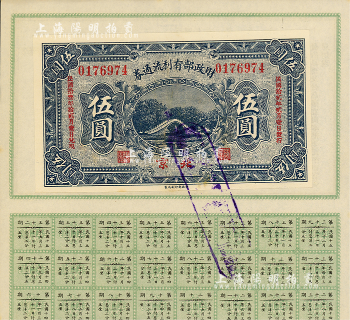 民国拾贰年(1923年)财政部有利流通券伍圆,北京地名,附带有财政部息票,九成新