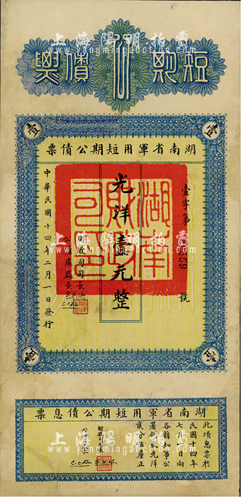 民国十四年(1925年)湖南省军用短期公债票光洋壹元,附有息票,少见品,有修补,八成新