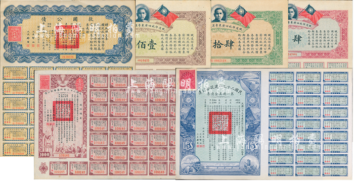 民国债券6种,详分:1930年铁道部收回广东粤汉铁路公债券肆圆、肆拾圆、壹佰圆;1937年救国公债拾圆;1940年建设金公债·第一期美金债票伍圆;1944年同盟胜利公债壹仟圆;八至九成新