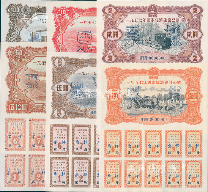 1957年国家经济建设公债壹圆、贰圆、伍圆、拾圆、伍拾圆、壹佰圆票样共6种全套,正背共12枚,九五成新