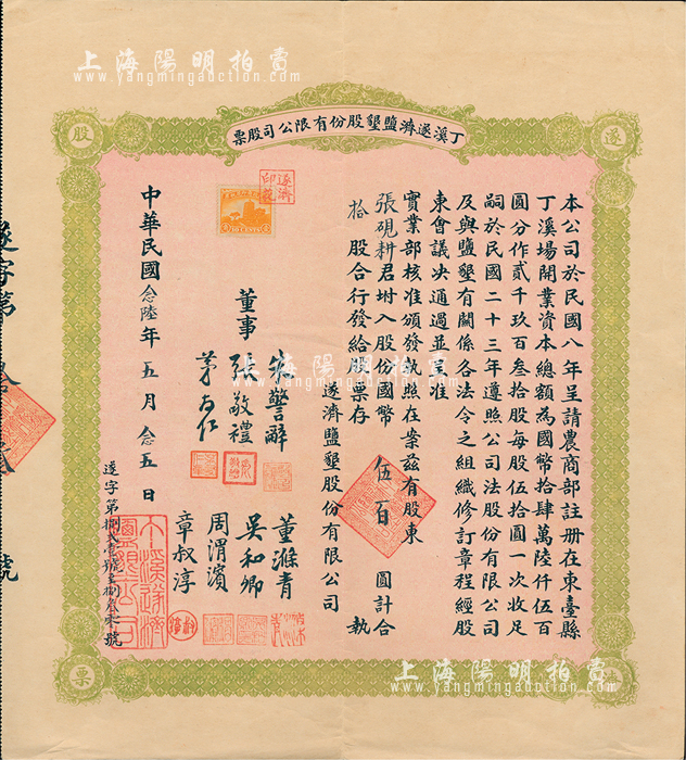 民国念陆年(1937年)丁溪遂济盐垦股份有限公司股票,拾股计银圆伍百圆,该公司乃1919年由清末状元、著名实业家张謇等创办于江苏东台县;八五成新