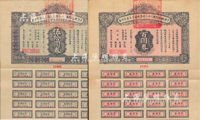 民国二十三年(1934年)平汉铁路民国二十二年清理员工欠薪支付券伍拾圆券、百圆券共2枚不同,均附带有息票;台湾藏家出品,七至八成新