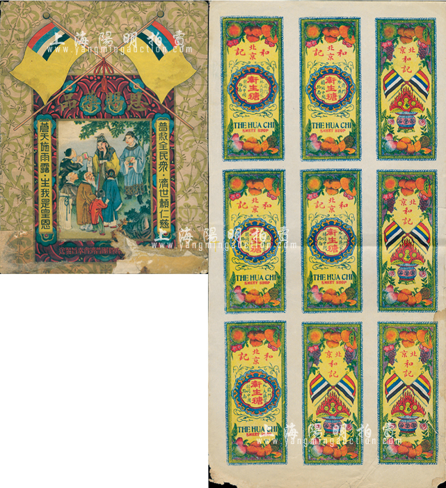 民国初期老北京广告商标等2种,详分:北京和记卫生糖小广告9张联体、“恩赐药品”彩色广告信封1个,均上印五色旗,保存尚可,敬请预览