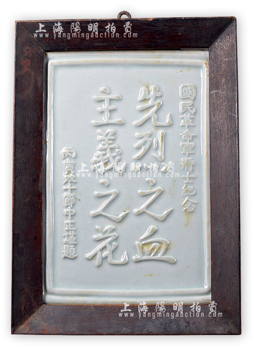 丙寅年(1926年)“国民革命军将士纪念”瓷板1块,此乃双十节时由蒋中正谨题,上题“先烈之血、主义之花”,或属北伐战争之纪念品;保存甚佳,敬请预览