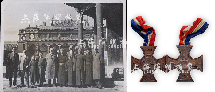 1936年晋绥剿匪军总指挥部赠“绥远挺战前线服务纪念”章1枚,上有“民族先锋”字样,背面图案为“阵亡将士纪念碑”,此乃傅作义将军绥远抗战之历史见证;另附“抗战绥远前线工作组”历史老照片1张;保存尚佳,敬请预览