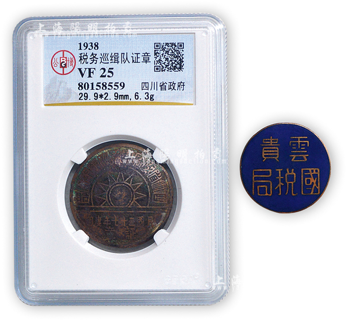 民国税务类证章2枚,详分:1938年“四川省政府税务巡缉队证章”1枚,由北京公博钱币鉴定评级;“云贵国税局”证章1枚;均保存尚佳,敬请预览