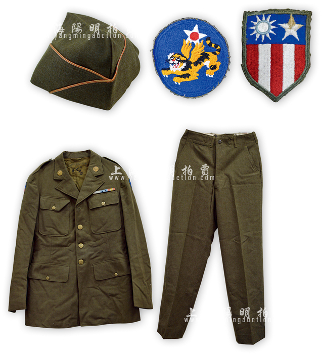 抗战时期“飞虎队”下士军服1套(上衣+裤子+空帽),军绿色,双臂佩戴有美国与当时国民政府共颁的袖标及飞虎标志,纽扣上均为美国国徽;源于美国回流,保存尚佳,敬请预览