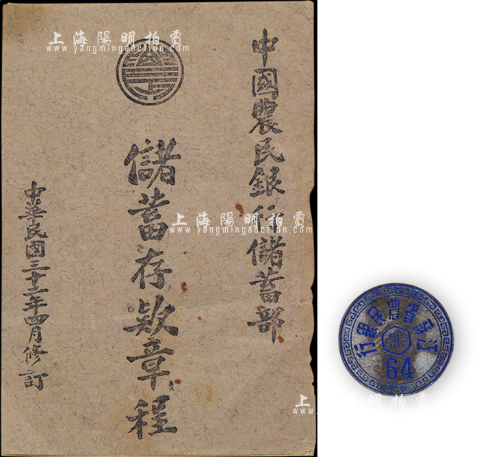 民国时期“江苏省农民银行”证章1枚,背有“上海华明公司”字样,另附1943年《中国农民银行储蓄部储蓄存款章程》1册;保存尚佳,敬请预览