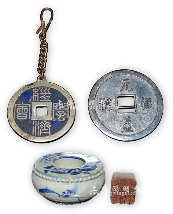 民国早期浙江地区金融实物一组共4件,详分:“浙江经济学会”古钱状徽章1枚、“元益银号”古钱状职员证章1枚、钱庄专用“特价伸算、银纸通用、毫予交易”字样木章1个、点钞用瓷器罐1件,颇具特色;保存甚佳,敬请预览