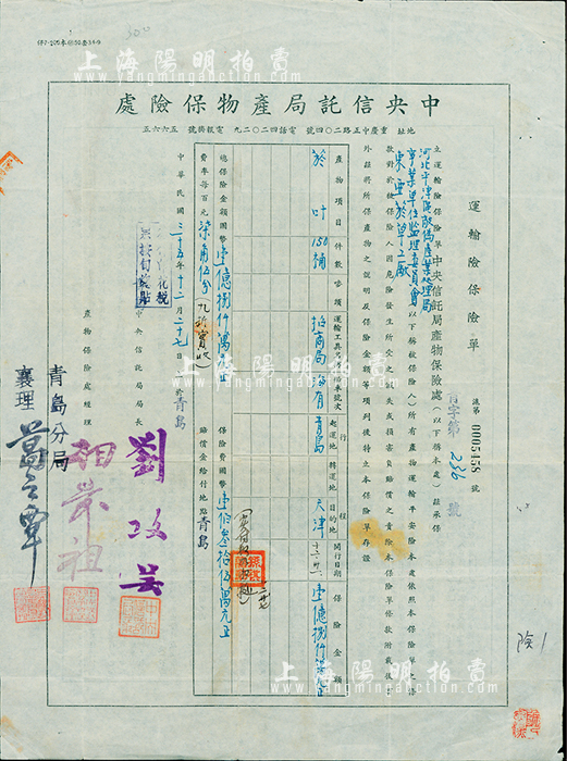 民国三十五年(1946年)中央信托局产物保险处·运输险保险单1份,发行于青岛,投保人为东亚烟草工厂,由局长刘攻芸等签署,八成新