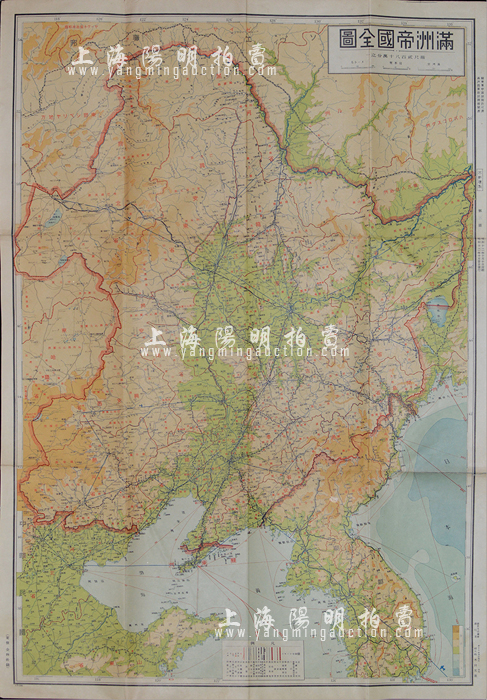 昭和十二年(1937年)《满洲帝国全图》彩色地图1张,尺寸540×780mm,,图上绘制有安东省、奉天省、锦州省、吉林省、热河省、龙江省、四平省、新京特别市等19个省及1个特别市,对各种铁道、航空路、大路及小路、海底电线等划分极为详尽,乃属日本侵华之重要罪证;源于日本回流,八成新