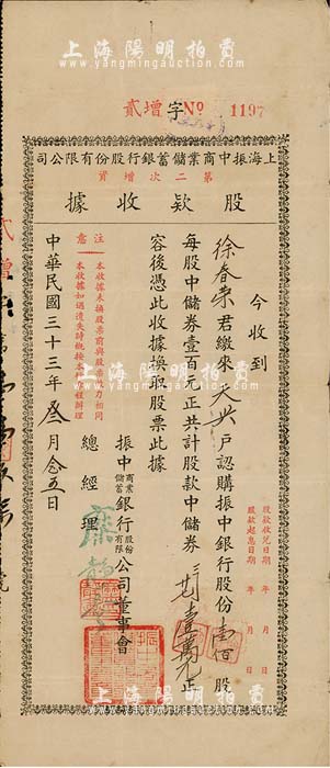 民国三十三年(1944年)上海振中商业储蓄银行股份有限公司第二次增资股款收据,壹佰股计中储券壹万元,近八成新