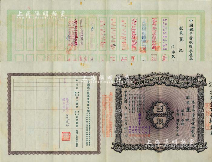 民国六年(1917年)中国银行股份有限公司股票,壹股国币壹百元,天津分行发行,票上由常务董事郭外峰、徐堪、宋子文、孔祥熙、宋汉章、莫德忠、陈辉德(光甫)等签名(此种签名版式极为少见),背面流通状况明显,兑付股息至1965年,少见,八五成新