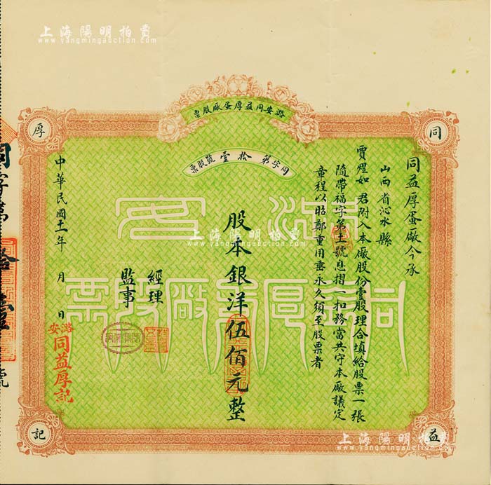民国十一年(1922年)潞安同益厚蛋厂股票,壹股计股本洋伍佰元,票上股东贾煜如即为国民党政要贾景德氏(“山西王”阎锡山终身的秘书长),少见品,八五成新