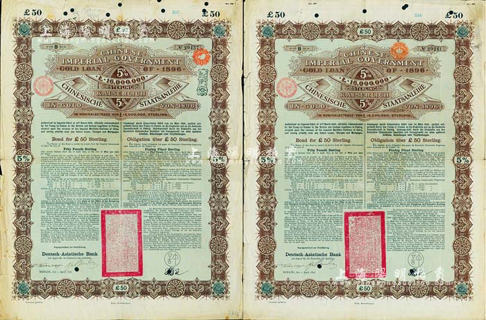 1896年大清中华帝国政府英德借款金债券50镑共2枚,由德华银行(Deutsch-Asiatische Bank)代理发行,驻德公使许景澄签章,满版水印,七五成新