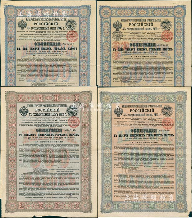 1902年俄国发行对清朝政府(庚子赔款)借款债券500马克、1000马克、2000马克、5000马克共4枚全套,背英文条款中有“China”(中国)及相关说明,满版水印,成套者少见,八成新