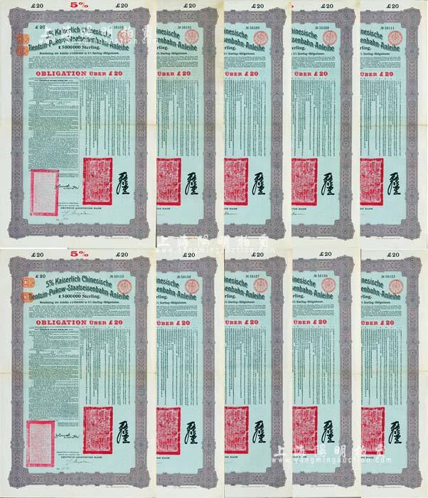 1908年(光绪三十四年)大清帝国政府对外发行津浦铁路债券绿底紫色20英镑共10枚,由德华银行(Deutsch-Asiatische Bank)代理发行,票上印有中文;海外藏家出品,八至八五成新