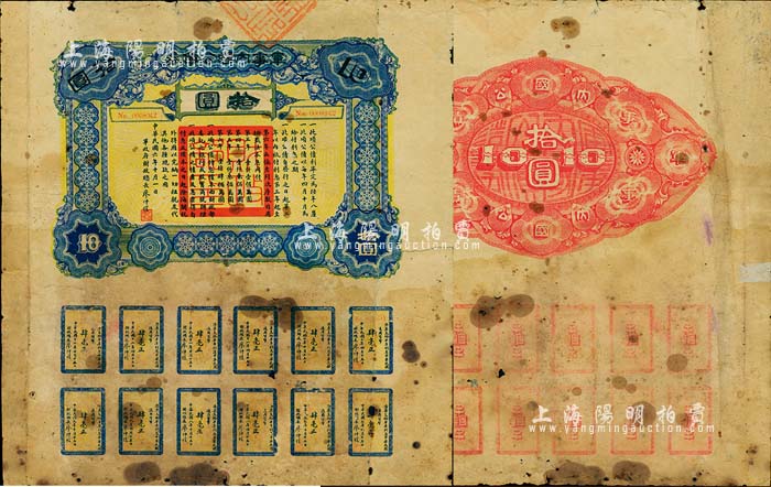 民国六年(1917年)军事内国公债券拾圆,由广东军政府发行,廖仲恺签署;此面额券存世罕见,有破损及贴痕,六成新
