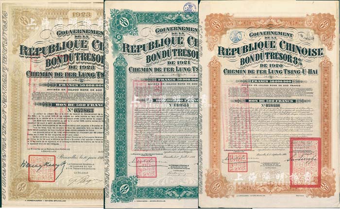 中国政府对外发行督办陇秦豫海铁路公债(在比利时发行版)共3枚全套,详分:1920年棕红色500法郎、1921年绿色500法郎、1923年棕色版500法郎,票上印有“中华民国驻比利时特命全权公使印”,均附带有息票;八成新