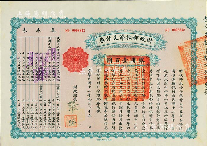 民国十二年(1923年)财政部秋节支付券银圆壹百圆,由北洋政府财政总长张弧签署,九五成新