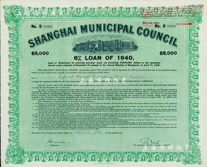 1940年上海工部局市政债券5000元,此大面额券较罕见,八五成新