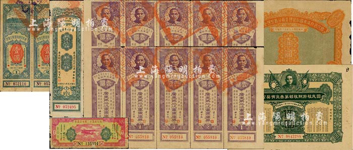 广东债券等7枚,详分:1927年国民政府财政部第叁次有奖公债伍圆;1928年国民政府广东国税管理委员公署整理金融公债壹圆;民国十九年广东整理金融库券·广东通用银毫壹圆;1931年广东第二次军需库券壹圆5联张共2版;1932年广东省国防要塞公债票壹圆2张联体;1933年航空救国第二期有奖义券壹圆;七至九成新