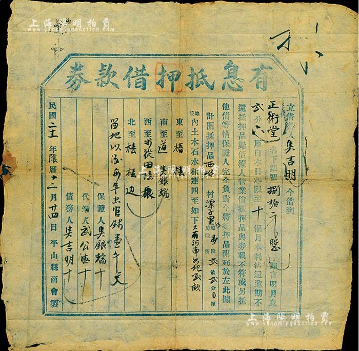 民国二十一年(1932年)“有息抵押借款券”一张,由(河北省)平山县商会制印;是项借券,可视同为私人债券文书之一种,颇具研究价值;少见,八成新
