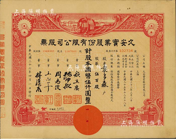 民国三十六年(1947年)久安实业股份有限公司股票,伍百股计国币伍仟圆,票上董事周志俊氏乃北洋政府财政总长周学熙之次子、王志莘乃民国著名银行家;八成新