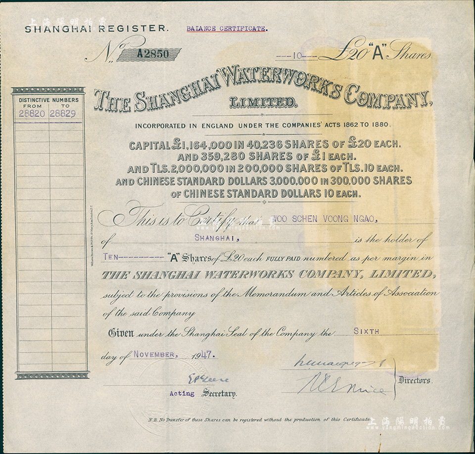 1947年(英商)上海自来水公司股票,甲种A股10股(每股20英镑),白纸印刷,少见,八成新