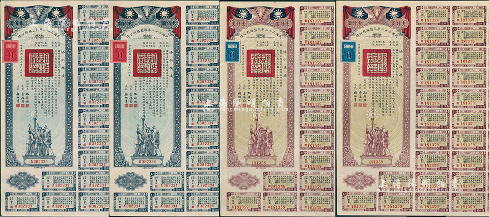 民国三十二年同盟胜利公债贰佰圆、壹仟圆各2枚连号,合计共有4枚,由财政部长孔祥熙签署,附带有息票,九成新