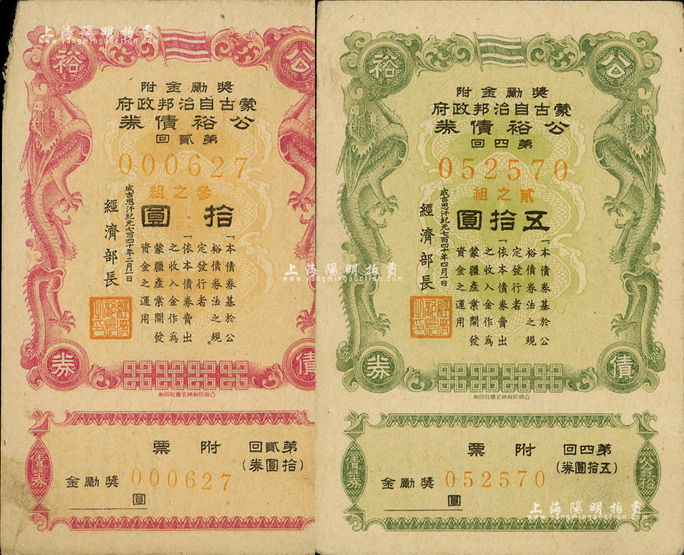 成吉思汗纪元七百四十年(1945年)蒙古自治邦政府公裕债券·第贰回拾圆、第四回五拾圆共2枚不同,日伪蒙疆政权发行,七五至八五成新