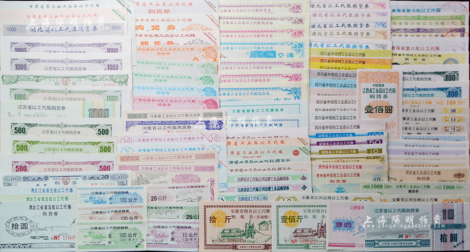 1989-95年新中国各省以工代赈购货券共100种不同,内含十几个不同省份发行,部分有水印;此为计划经济时代之变相纸币,颇具时代意义,九成至全新,敬请预览
