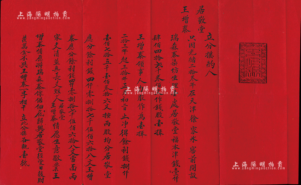 光绪三拾年(1904年)“立分拨约”1份,事为居敬堂、王增泰2人因光绪二拾叁年(1897年)在天津徐家冰窖前开设瑞森泰染坊生理,由居敬堂出资津钱1442千300文作为钱股壹俸、王增泰以人力作为壹俸,至光绪三拾年正月初二日止,净得余利钱8175千136文,由两位股东平均分配,并将生意歇业,特立此分拨约;此种商号歇业合同,颇具史料研究价值,亦首度公诸于拍卖,保存甚佳,敬请预览